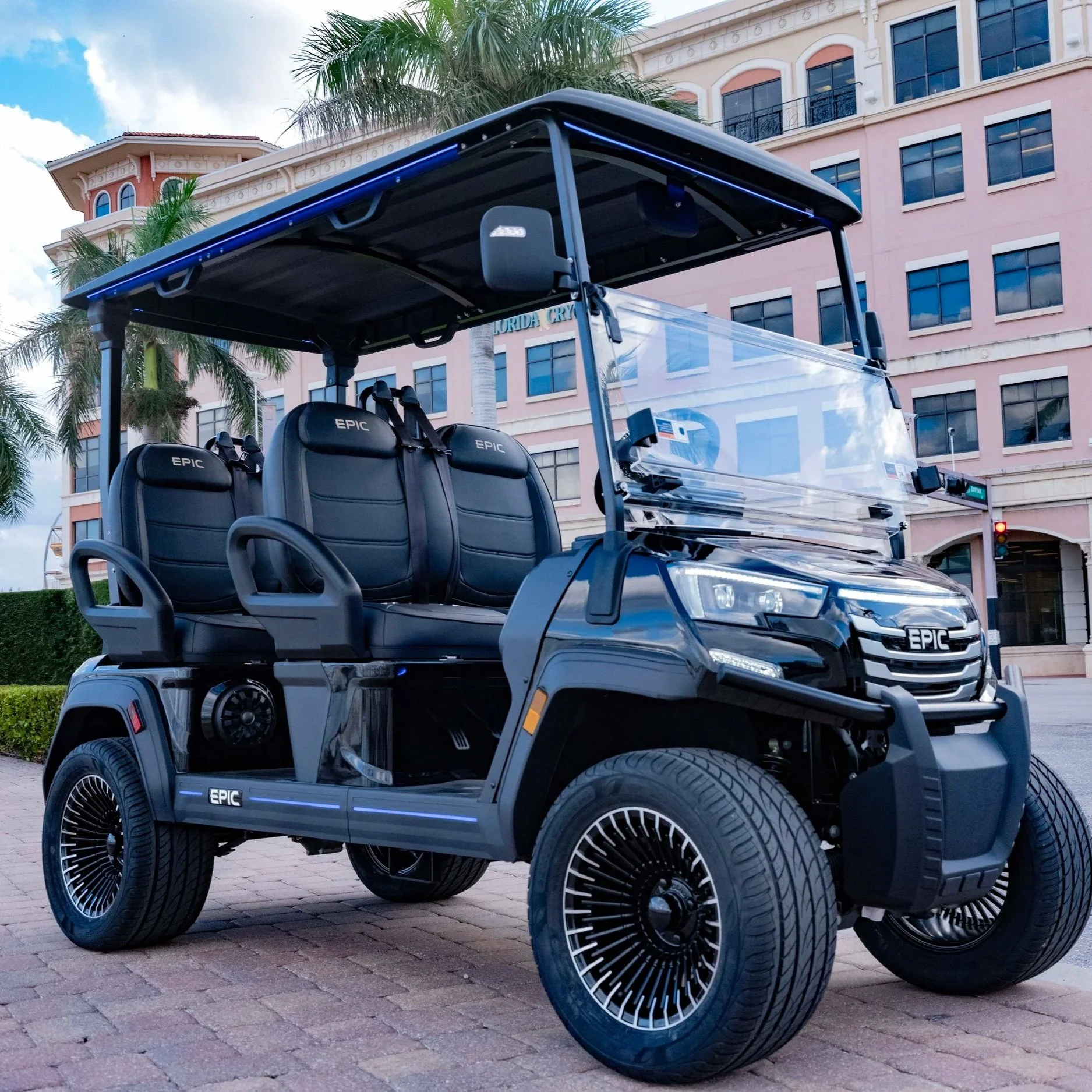 The brand new Epic E60FX is the most in-demand golf cart that is taking the industry by storm! This ultimate street-legal 6-seater golf cart is equipped with premium 14” street-ready tires that provide an ultra smooth ride. Play the tunes loud on its superior built-in marine-grade sound system, and turn heads with the stunning accent lighting adorned throughout. This Epic E60FX golf cart comes in six stylish colors!