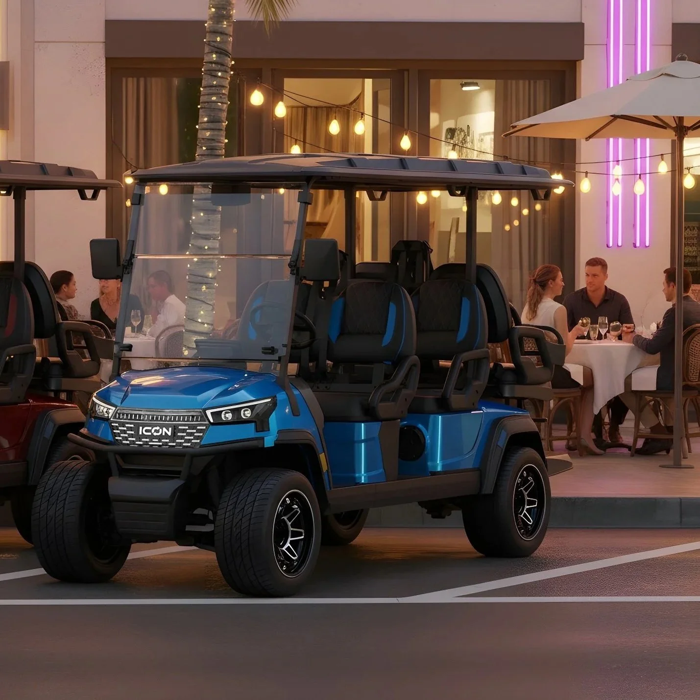 The ICON i40X Golf Cart is built for more than just the course—it’s built for connection. With spacious four-passenger seating, premium comfort features, and sleek modern styling, every ride feels like an adventure. Every Ride is an Experience.